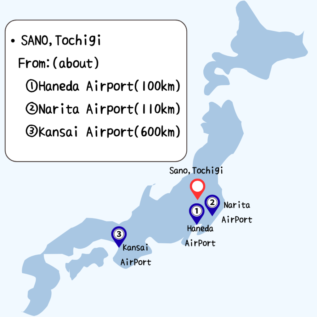 Take an airport limousine bus from Narita International Airport to Sano New City Bus Terminal.